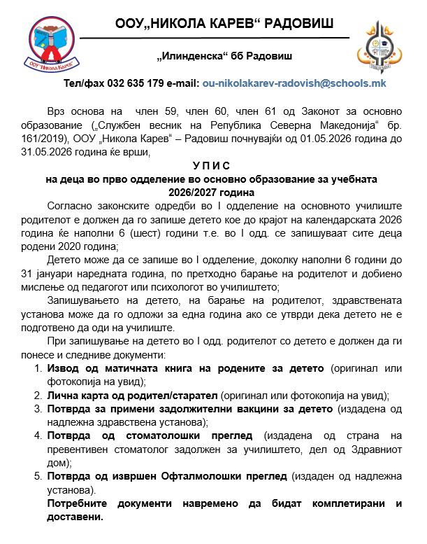 Информации Упис на првачиња OOU Nikola Karev Radovis April 22, 2026 Continue Reading Previous: Во текот на месец март и почетокот на април учениците реализираа низа едукативни содржини посветени на велосипедот како превозно средство и дел од секојдневието Последни новости Во текот на месец март и почетокот на април учениците реализираа низа едукативни содржини посветени на велосипедот како превозно средство и дел од секојдневието 1 min read Информации Во текот на месец март и почетокот на април учениците реализираа низа едукативни содржини посветени на велосипедот како превозно средство и дел од секојдневието April 16, 2026 64-ти Државен натпревар за ученици во основно музичко образование 1 min read Информации 64-ти Државен натпревар за ученици во основно музичко образование April 16, 2026 Регионален натпревар по пијано, хармоника и теорија на музика Информации Регионален натпревар по пијано, хармоника и теорија на музика April 2, 2026
