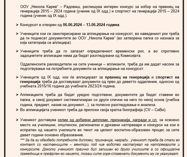Барање за разгледување на документи по основ на конкурс за првенец на генерацијата 2024